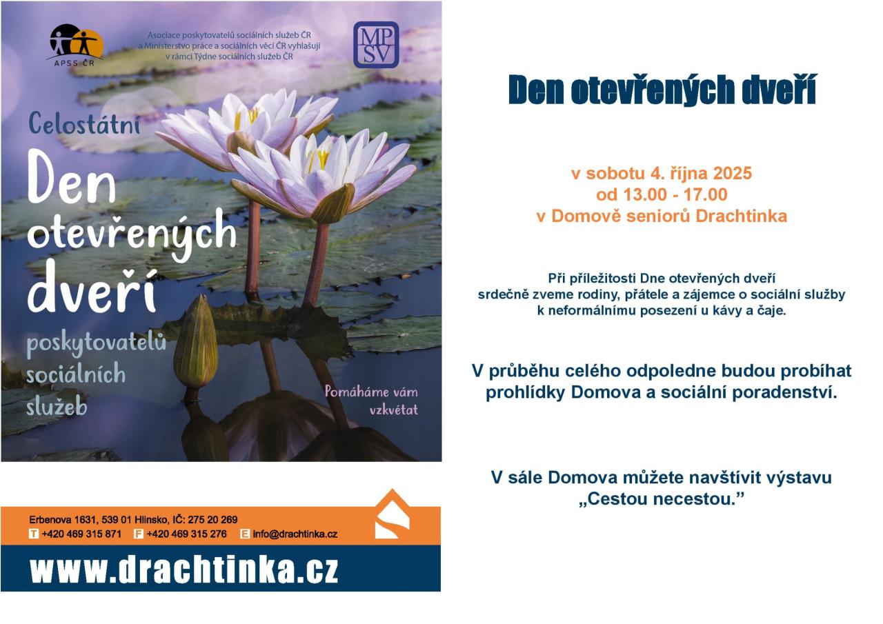 Srdečně zveme veřejnost k nahlédnutí do vnitřních prostor Domova seniorů Drachtinka v sobotu 4.10.2025.